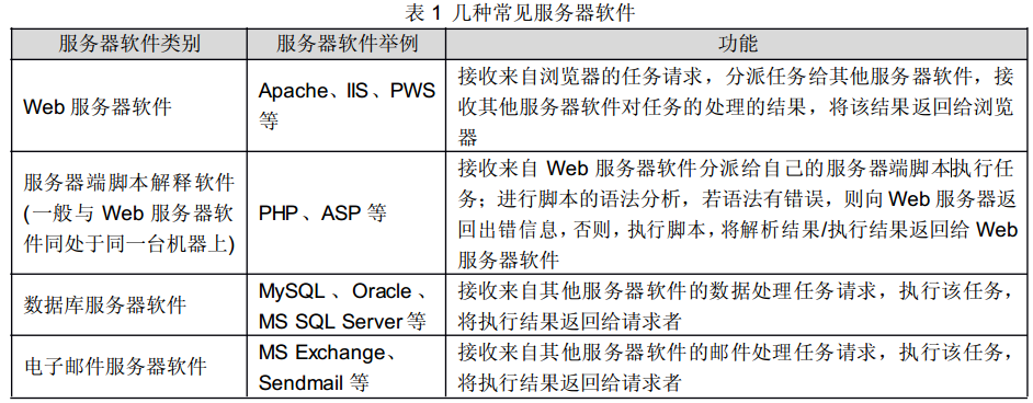 按照服务任务,常见的几种服务器软件如表 1 所示。