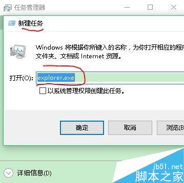 Win10需要切换到“简略信息“,非空白处右击,”运行新任务“输入explorer.exe