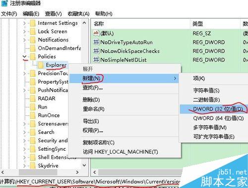 定位到HKEY_CURRENT_USER\software\microsoft\windows\current version\polices\exlorer