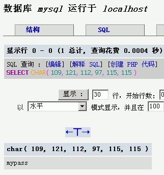 这样我们就得出结果了,然后我们再用char()函数还原出来就好了。至于其他更多函数,大家可以自己去试验,限于篇幅也不多说了。