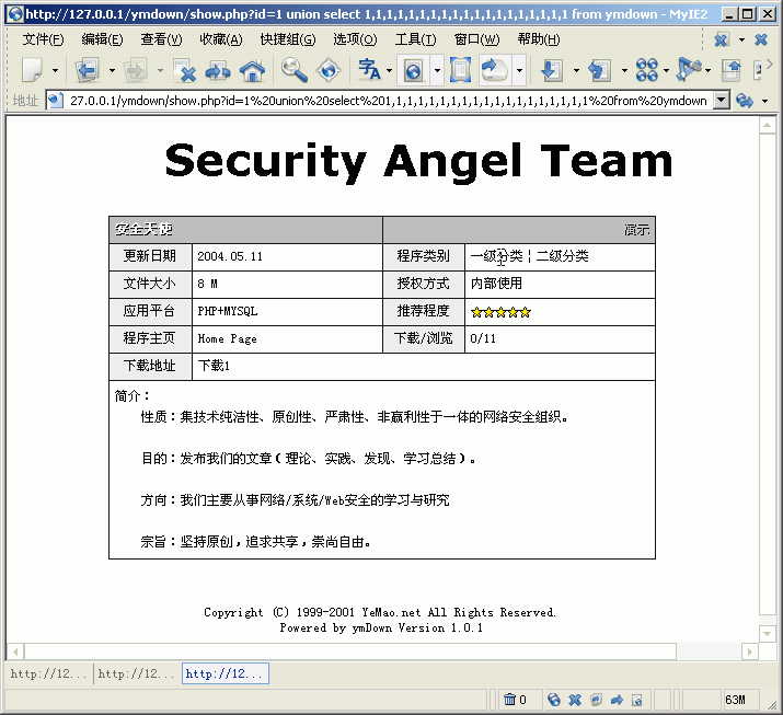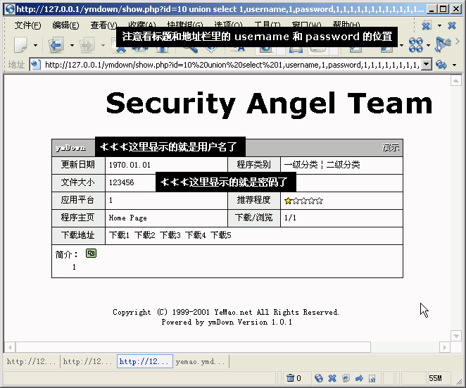 用户名和密码的数据类型都是varchar,所以我们要选择ymdown表里数据类型是varchar来,如果把varchar的数据写到int的地方当然是不可能显示的了,由于updatetime(更新日期)的长度是20,可能会出现显示不完全的情况,我们就把用户名显示在name(软件标题)那里,密码显示在size(文件大小)那里好了,在19个“1”中,name和size分别是第二个和第四个,我们提交: