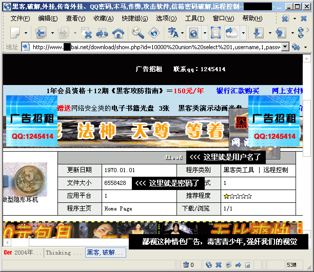 这样就把后面的语句给注释掉了!说说这两种提交的不同之处,我们提交的第一句是利用逻辑运算,在ASP中运用可以说是非常广泛的,这个不用说了吧?第二、三句是根据mysql的特性,mysql支持/*和#两种注释格式,所以我们提交的时候是把后面的代码注释掉,值得注意的是由于编码问题,在IE地址栏里提交#会变成空的,所以我们在地址栏提交的时候,应该提交%23,才会变成#,就成功注释了,这个比逻辑运算简单得多了,由此可以看出PHP比ASP强大灵活多了。