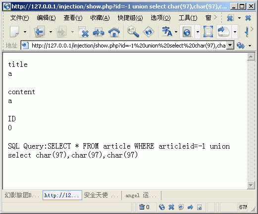 http://127.0.0.1/injection/show.php?id=-1 union select char(97),char(97),char(97) |