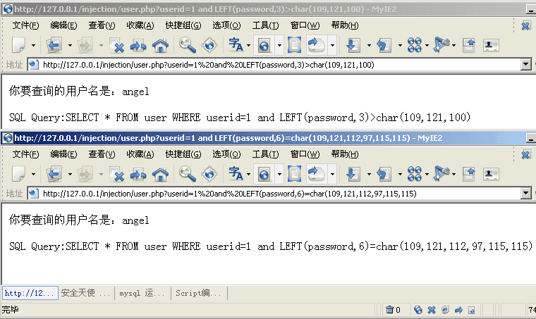 相同的就是当条件为真时,就会给出正确的提示信息,如果我们构造出后面的AND条件部分,并使这部分为真,那我们的目的也就达到了,还是利用刚才建立的user数据库,用户名为angel,密码为mypass,