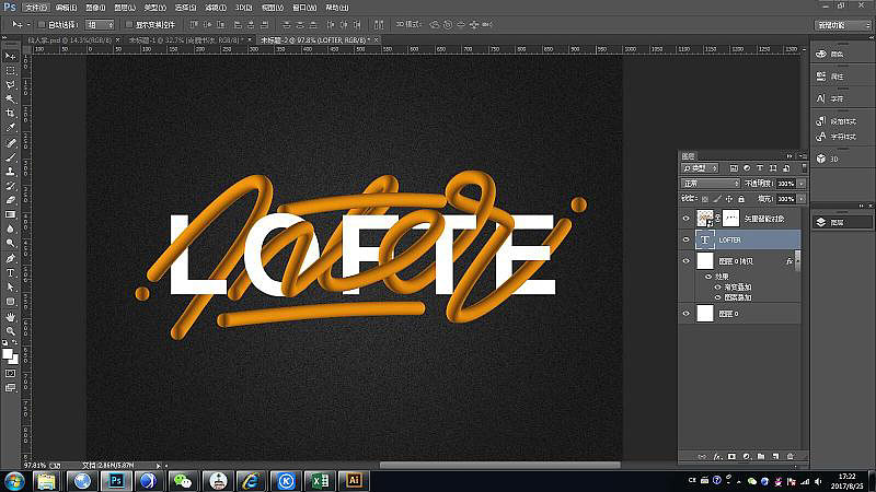 7、回到AI中选中做好的图形,ctrl+C 切换到PS、ctrl+v,选择智能对象,用文字工具输入LOFTER字样,文字图层至于下层。 给基础图形增加蒙版,并用画笔工具在蒙版上进行删减(黑透百不透的原理),实现字母文字与基础图形穿插的效果,这一步需要细心慢调。