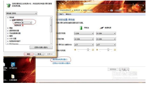 4、再不行的话就右击电源选项,然后点击更改高级电源设置,然后将使用电池选择为“是”,点击确定退出应该就可以了。
