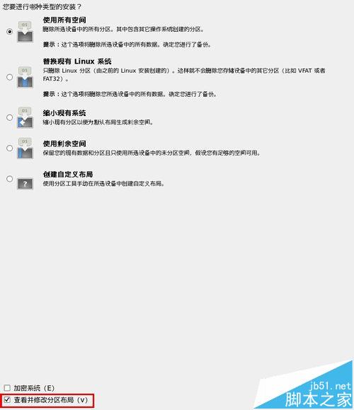 在安装Centos系统的时候,到了选择时区并设置了根帐户(root)的密码后,会看到使用安装空间等选项时,如图,就可以在左下角打勾:查看并修改分区布局,按下一步来进行分区了。