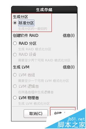 在生成存储对话框中,选择:标准分区,如图。再创建。