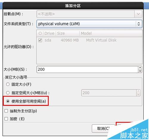 看到了吧,文件系统类型是:physical volume(lvm),大小应该选择全部可用空间,如图,再确定以返回上一层。