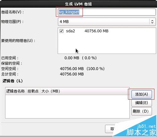 然后开始LVM卷组分区了,开始之前,你可以先设置LVM卷名,如图,默认也行,再按添加开始添加分区了。