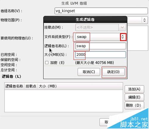 先来添加SWAP逻辑分区吧,如图,先选择文件系统类型为:SWAP,输入名字,设置空间大小,确定。