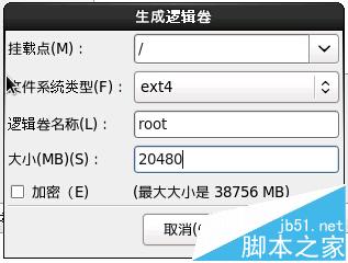 再来添加根分区20G,选择挂载点为:/,文件系统类型为默认的EXT4即可,设置名称和空间大小,如图。按确定。