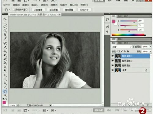 在Photoshop(以CS5版本为例)中打开这张照片。为了便于效果不好时能快速恢复,打开照片后可以将背景图层复制,直接将背景图层拖放到下面的新建图层按钮上放开即可。接下来在复制的新图层“背景 副本”中进行操作,点击菜单命令“图像→调整→去色”,将本层图像转换成黑白图。同上方法将这个黑白图层再复制两次,分别得到“背景 副本2”和“背景 副本3”图层(图2)。
