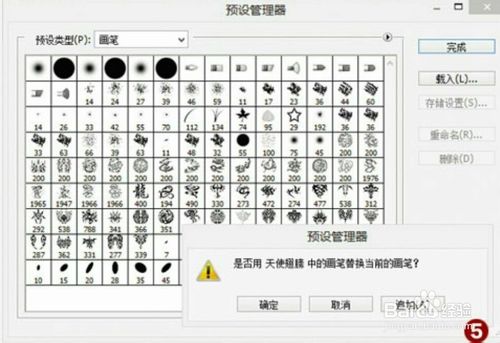 如果对上面的素描效果还不满意,接下来可进一步打造,添加真实手工绘制的效果。网上有很多热心的网友,将自己手绘效果的人或物的元素制作成“笔刷”,如人物的头发、五官、衣装饰品,在打开的预设管理器窗口中可以看到内置的笔刷很少。点击管理器右上方的黑三角按钮,从弹出的列表中即可看到刚刚复制的笔刷了,选择之后,又会弹出对话框,询问是替代原来的笔刷,还是追加到原笔刷的后面,一般来说选择“追加”即可(图5)。最后点击“完成”返回。