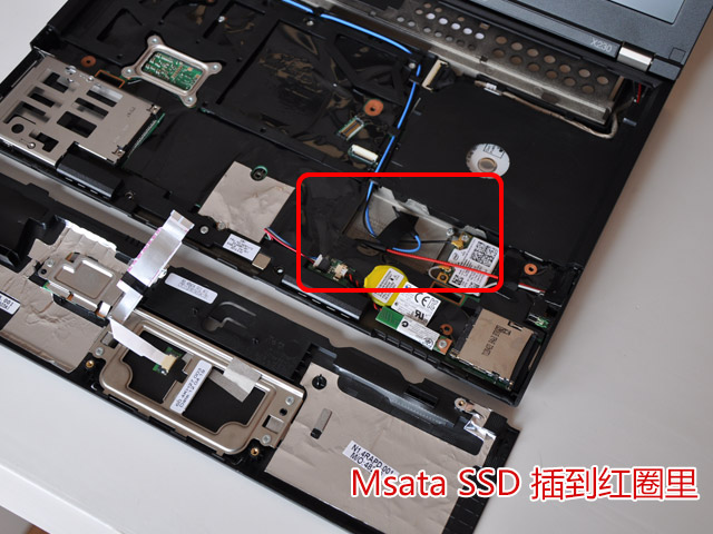 4,画红圈的地方,就是插msata ssd 的位置了:实际操作的时候,并不需要把掌托完全取下,我们为了让大家看的更清楚,所以取下来了: