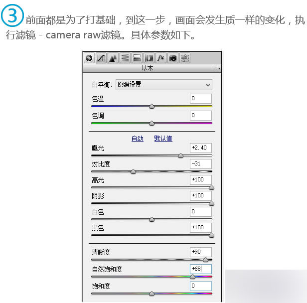 3、前面都是为了打基础,到这一步,画面会发生质一样的变化,执行:滤镜 > Camera raw滤镜,具体参数如下。