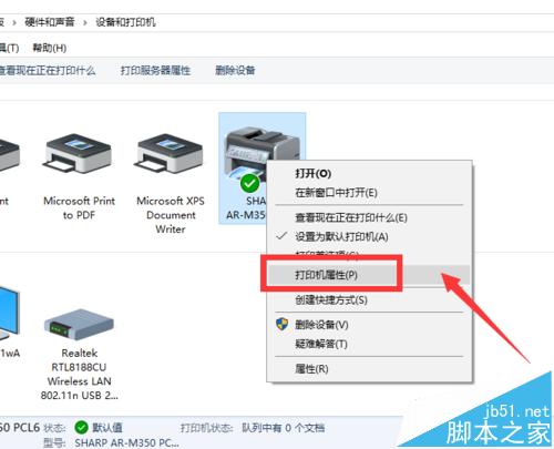 4、在选定的打印机图标上右击-打印机属性,打开打印机属性面板