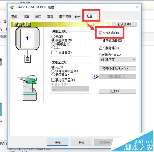 5、在打开的面板中选择配置选项卡-双面打印前的方框里打上对勾(点一下就打上了)