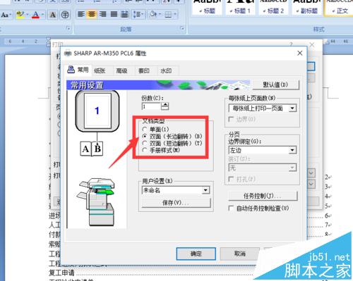 6、确定-关了对话框就行。咱们试一下看看。双面打印选项是可以选择的。