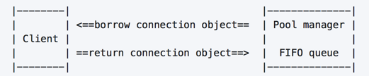 |--------| |--------------| | | <==borrow connection object== | Pool manager | | Client | | | | | ==return connection object==> | FIFO queue | |--------| |--------------|