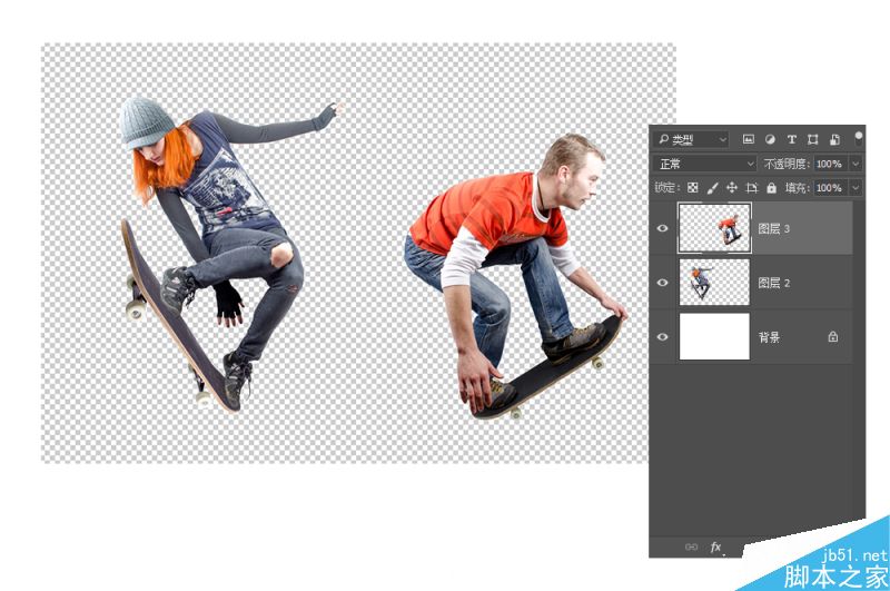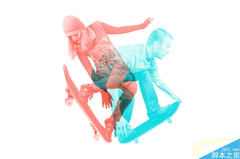 首先,是选择两个不同的人像重影,在此我们运用滑板运动的人物造型,体现某种运动中的姿态韵律。你也可以选用其他的动态人物比如舞蹈、跳水、溜冰等等。之所以选择动态造型,主要是为了取其姿态的灵动感,将其有机结合。