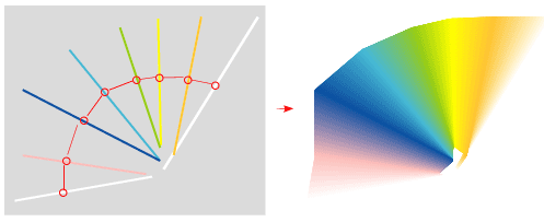 绘制如图8左图所示的多个线条,并设置不同的描边颜色。确认第1条和最后1条为白色,因为这两条将要设置为透明。使用“混合工具”从左到右依次单击每个线条的边缘,制作出彩虹渐变,效果如图8右图所示。