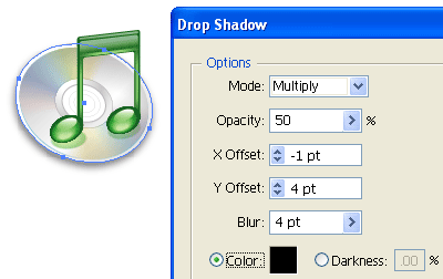 最后一步是为CD图形应用投影效果。选中CD路径,然后执行菜单命令“效果>风格化>投影”,并在“投影”对话框应用如图13所示的设置。