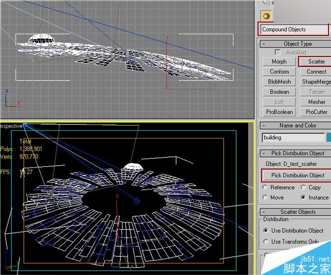 选择第十一步建好的模型,并选择scatter,将其添加到场景中。(图13)
