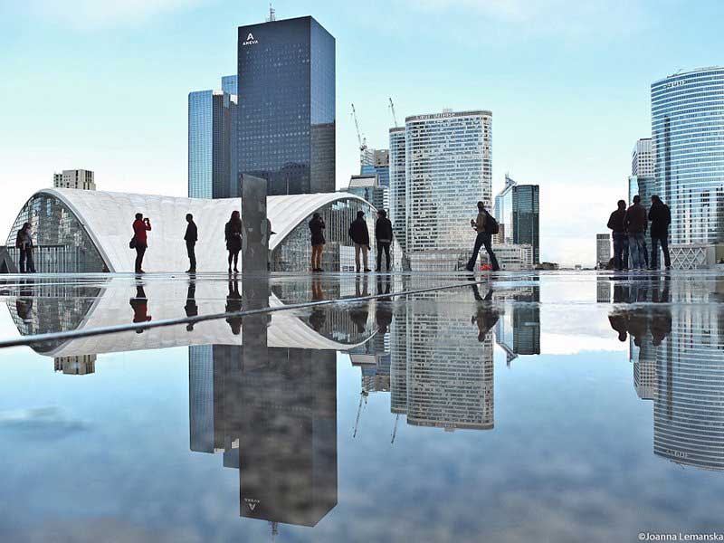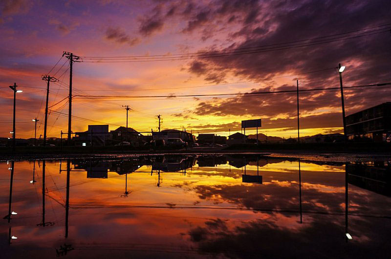当你面前有一片积水,首先令人想到的不外乎是镜面反射效果吧。此时,以最靠近水面的角度取景,能最大程度截取积水的面积,让画面看起来像一大片水面,而不是一小滩积水。能达到最好的镜面效果。