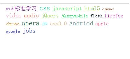<div id="wrap"> <a href="#">web标准学习</a> <a href="#">css</a> <a href="#">javascript</a> <a href="#">html5</a> <a href="#">canvas</a> <a href="#">video</a> <a href="#">audio</a> <a href="#">jQuery</a> <a href="#">jQuerymobile</a> <a href="#">flash</a> <a href="#">firefox</a> <a href="#">chrome</a> <a href="#">opera</a> <a href="#">IE9</a> <a href="#">css3.0</a> <a href="#">andriod</a> <a href="#">apple</a> <a href="#">google</a> <a href="#">jobs</a> </div>