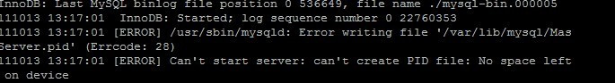 120321 14:23:54 [ERROR] Can't start server: can't create PID file: No space left on device