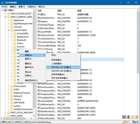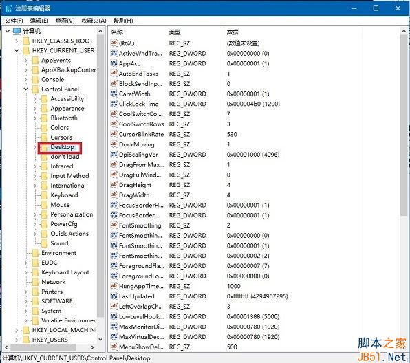 2、在注册表中依次打开路径HKEY_CURRENT_USER\Control Panel\Desktop;