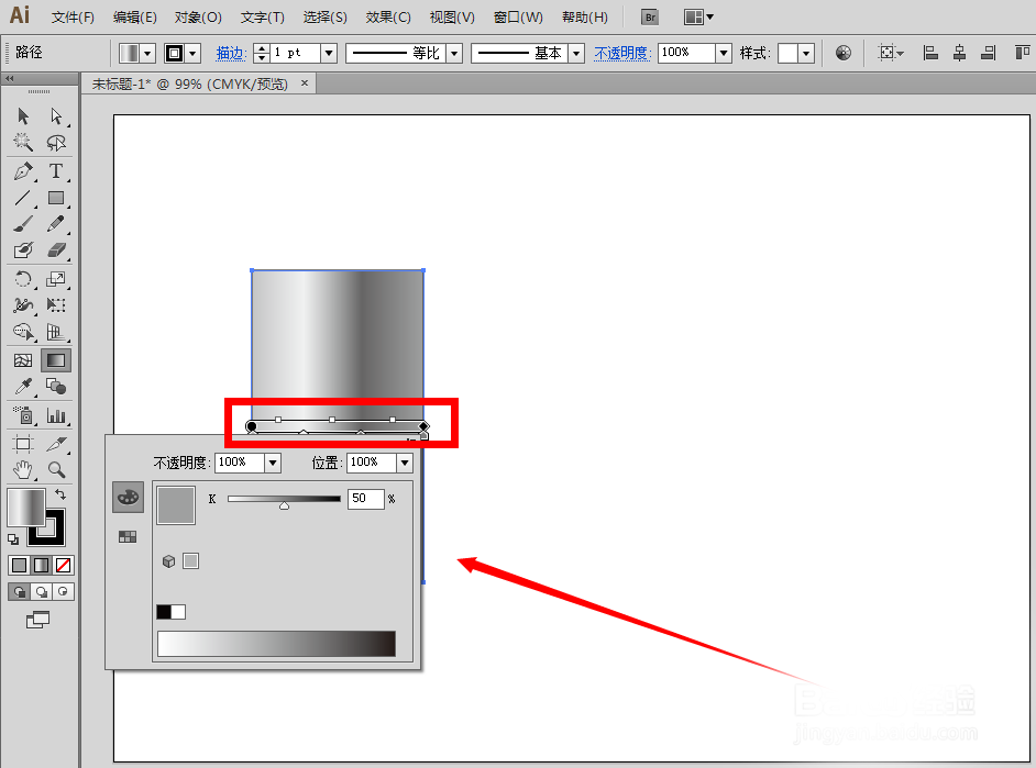 9、为了效果更佳,我们选中上面的椭圆形,再使用鼠标单击下渐变工具,调整下上面椭圆的渐变颜色,让它的渐变颜色方向跟矩形切面尽可能不一样