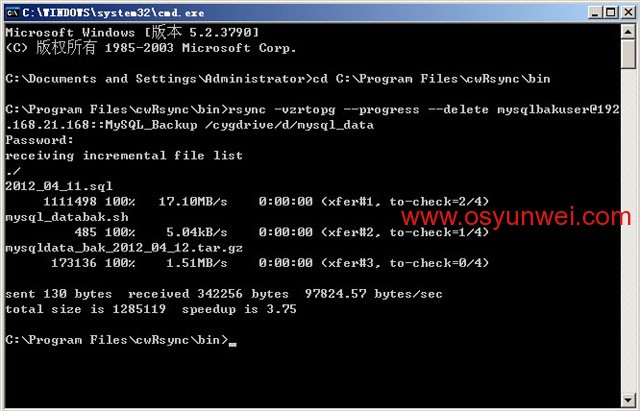 再输入rsync -vzrtopg --progress --delete [email protected]::MySQL_Backup /cygdrive/d/mysql_data