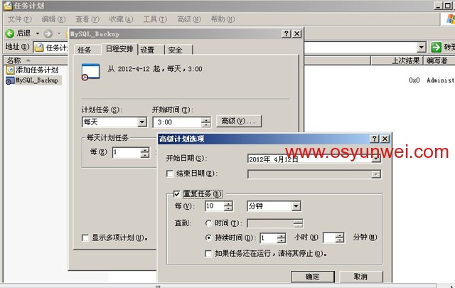 切换到日程安排来选项设置,还可以打开高级来设置每隔几分钟运行一次MySQL_Backup.bat这个脚本