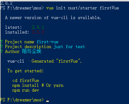 执行创建命令:vue init nuxt/starter [firstVue] firstVue为项目名