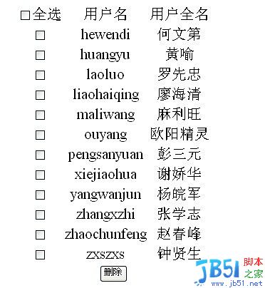 str.Append("<table><tr><td><input id='checkall' name='checkall' type='checkbox' onclick='CheckAll(this)'/>全选</td><td>用户名</td><td>用户全名</td></tr>");