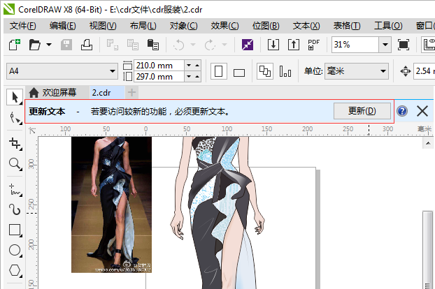 1. 双击运行CorelDRAW X8软件,Ctrl+O打开用先前版本创建的图形,即包含继承文本的文档,绘图窗口顶部会出现一个更新工具栏,如图所示。