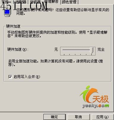 首先将屏幕状态切换到Windows 2003系统桌面上,然后用鼠标右击桌面的空白区域,从弹出的右键菜单中单击“属性”选项,打开系统的显示属性窗口;单击该窗口的“设置”标签,再在对应的标签页面中单击“高级”按钮,进入到高级显示属性设置界面;接下来再单击该设置界面中的“疑难解答”选项卡,并在其后出现的选项设置页面中,将“硬件加速”设置为“完全”,同时将“启用写入合并”选项(如图所示),并单击“确定”按钮,再将计算机系统重新启动一下,这样说不定就能将显卡驱动无法载入的故障顺利排除了。