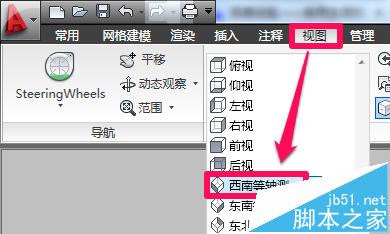 2、在菜单栏的视图中选择西南等轴测等三维视图模式。
