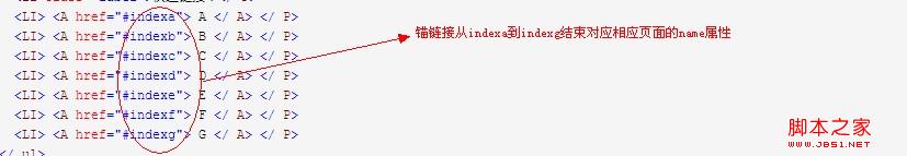 锚链接的href值在页面上按字母顺序列出的目标索引。从indexa到#indexg都针对其他页面上锚链接上面的匹配的name属性的值。