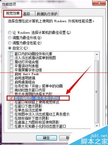 4、在win7系统xitongcheng.com/win7/弹出的性能选项窗口里面,大家点击“自定义(C)”按钮勾选其下的“显示缩略图,而不是显示图标”单选框点击“确定”按钮完成设置。如下图所示