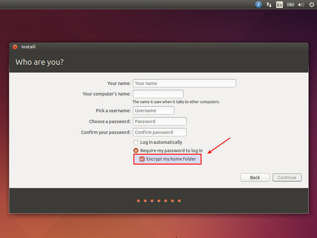 就像我所的,Ubuntu让我们在安装过程中选择是否加密/home目录。好吧,这是使用eCryptFS的最简单的一种方法。