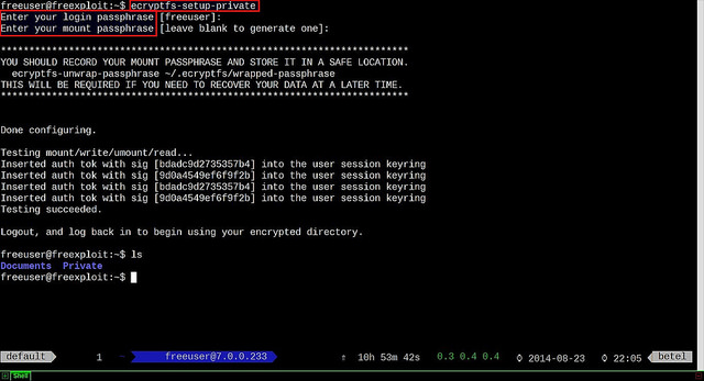 现在,我们可以开始把任何敏感文件放进~/Private文件夹里头了,它们会在我们登出时自动被加密并锁在~/.Private文件内。