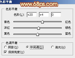 5、创建色彩平衡调整图层,对中间调,高光进行调整,参数设置如图9,10,确定后把蒙版填充黑色,用白色画笔把人物脸部及肤色部分擦出来,效果如图11。这一步把人物肤色调黄一点。