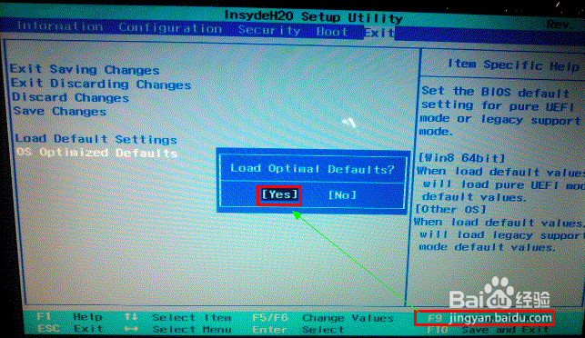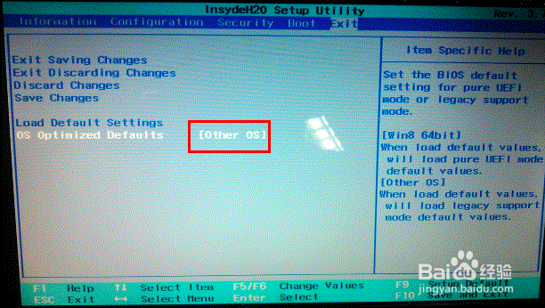 Y,U,Z,S,G系列机型:如Y400、Y500、Y480、Y580、S206、S300、S400、S405、Z380、Z480、Z485、U310、U410、U510、G480、G580、G780、G485、P580、N580等1. 按【F2】进入BIOS,部分机型需要按【FN】+【F2】进入BIOS,选择【EXIT】-【OS Optimized Defaults】将【win 8 64 BIT】选择为【Other OS】.如下图: