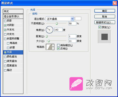 6、绘制光圈。画出个圆环形状然后调整图层样式。内阴影的数值分别为75;120;4;0;4;0。外发光75;0;6;28;50;0。光泽50;143;1;11。