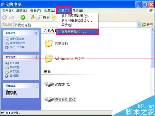 1,要修改系统文件隐藏功能,必须进入“文件夹选项”,进入方法,系统窗口,单击菜单栏“工具”,在弹出菜单中,选择“文件夹选项”。