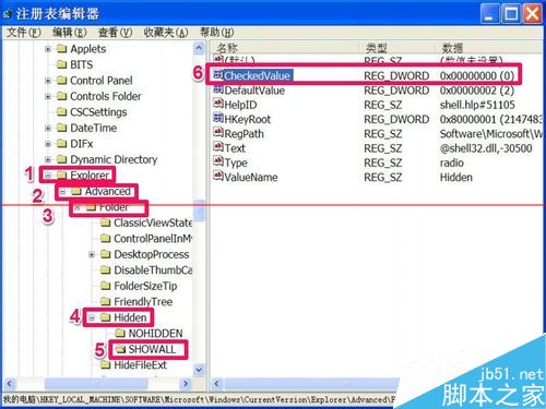 6,进入注册表后,按【HKEY_LOCAL_MACHINE\SOFTWARE\Microsoft\Windows\CurrentVersion\Explorer\Advanced\Folder\Hidden\SHOWALL】此路径找到右侧的Checkedvalue项,双击这项。