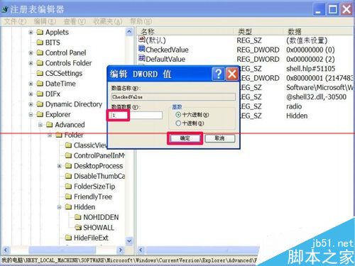 7,在编辑DWORD值窗口,将“数值数据”下的0值改为1值,然后按“确定”。这一项就修改过来了,提示,1值为允许修改隐藏属性,0值为不允许修改隐藏属性。